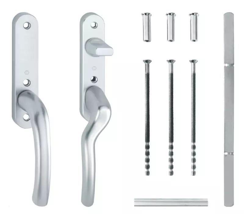 Helapaketti sisältää Tokyo 0710VK/350KL parvekeoven taivutettu painike (vasen) pitkäkilvellä (350KL) ja vääntönupilla (tähtikara 63 mm).