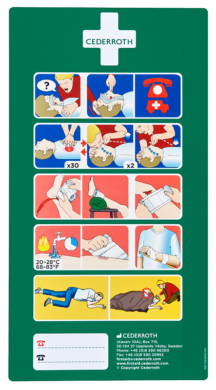 Cederroth hätäensiapuohje Itseliimautuva hätäensiapuohje Cederroth Haavanhoitopisteeseen. Ensiapuohjeet selkein kuvin ja symbolein.