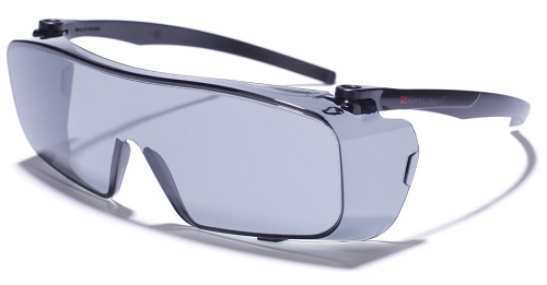 Suojalasit, joita voidaan käyttää tavallisten silmälasien päällä. Ohuet, joustavat sangat on kiinnitetty suojalasin yläreunaan, ratkaisu antaa lisätilaa omien silmälasien sangoille.