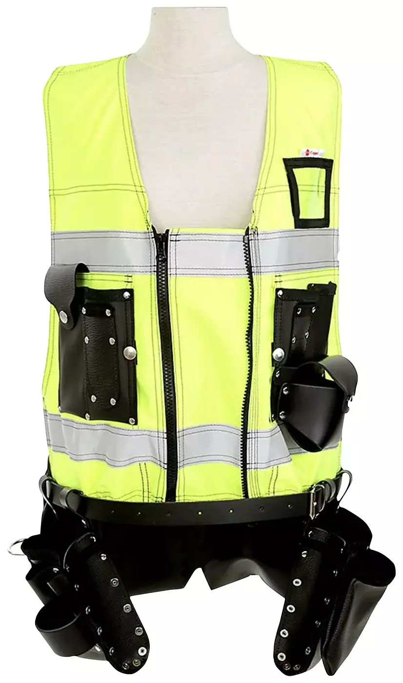 Huomiovärisessä Timperi Työkaluliivissä on yhdistetty työmukavuus ja turvallisuus. Kestävään työkaluliiviin on voidaan integroida Cresto 1118, 1128 tai