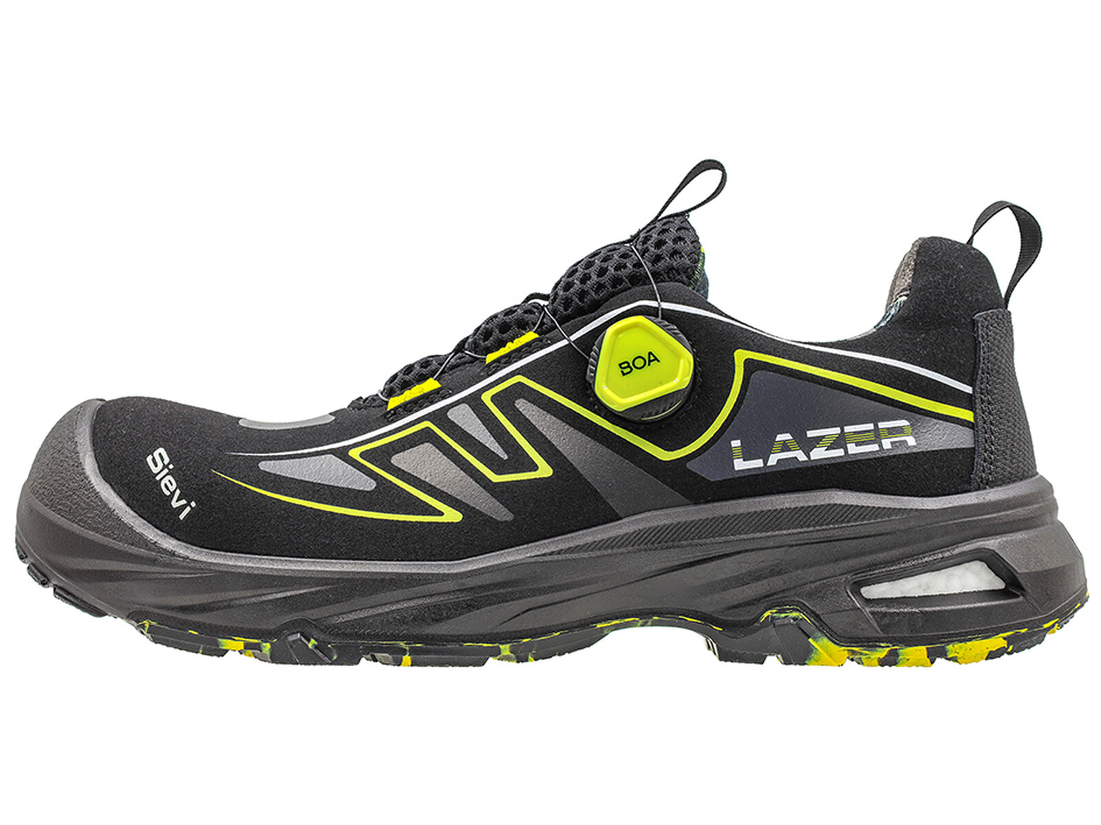 Lazer Roller+ turvajalkineessa on aukollinen kantarakenne. FlexEnergy®-joustoelementti näkyy jalkineen kannassa olevista aukoista, jotka