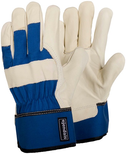 Nahkakäsine, Vuoriton, 1,0-1,1 mm, Naudan pintanahka, Puuvilla, Cat. I, Sininen, beige, Vahvike etusormessa, Vahvikkeet sormissa ja peukalossa,