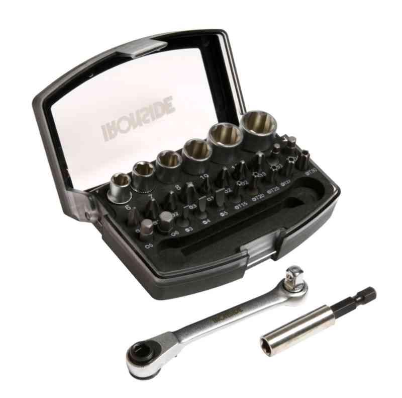 Vyökiinnikkeellä varustettu muovirasia sisältää 29 osaa. Pienoisräikkäavain ruuvikärjille ja hylsyille, magneettinen kärjenpidin, adapteri, Super Lock -