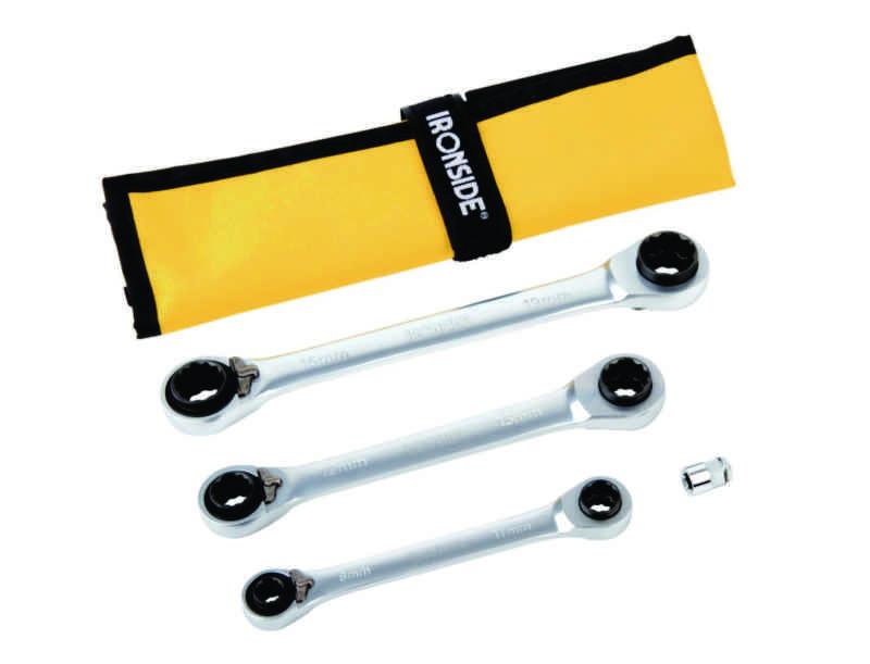 Kompakti sarja kromi-vanadiiniteräksisiä avaimia, 3+1 osaa ja 13 toimintoa. Nopea kiertosuunnan vaihto. Sisäpuolinen 12-kulmiolenkki. 72 hammasta.
