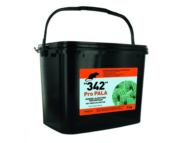 342 Pro Pala on käyttövalmis syötti hiirien ja rottien torjuntaan sisätiloissa sekä rottien torjuntaan rakennusten välittömässä läheisyydessä.