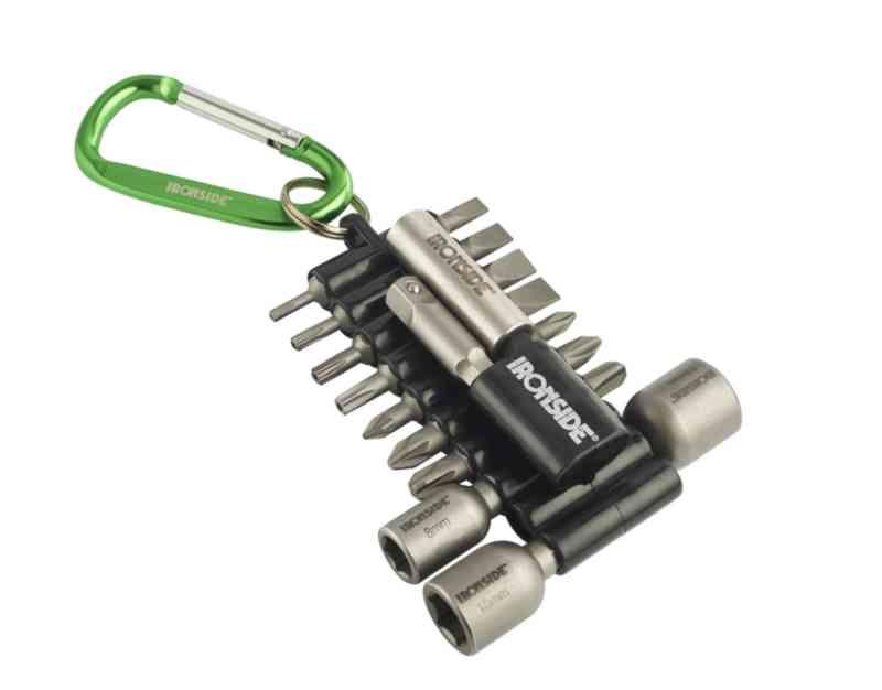 ¼" liitännällä: talttameisseli 4, 5, 6, 7 mm, Phillips nro 1, 2, 3, Pozi-meisseli 1, 2, 3, reiällinen Torx nro 10, 15, 20, 25. Vihreä karbiinihaka ja musta
