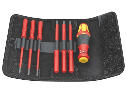 Wera Kraftform Kompakt. Seitsemänosainen sarja standardien IEC 60900 ja DIN EN 60900 mukaisesti valmistettuja ruuvitalttoja. Sisältää VDE-eristetyn kahvan (pituus 104 mm) sekä 6 erilaista VDE-eristettyä ruuvauskärkeä.
