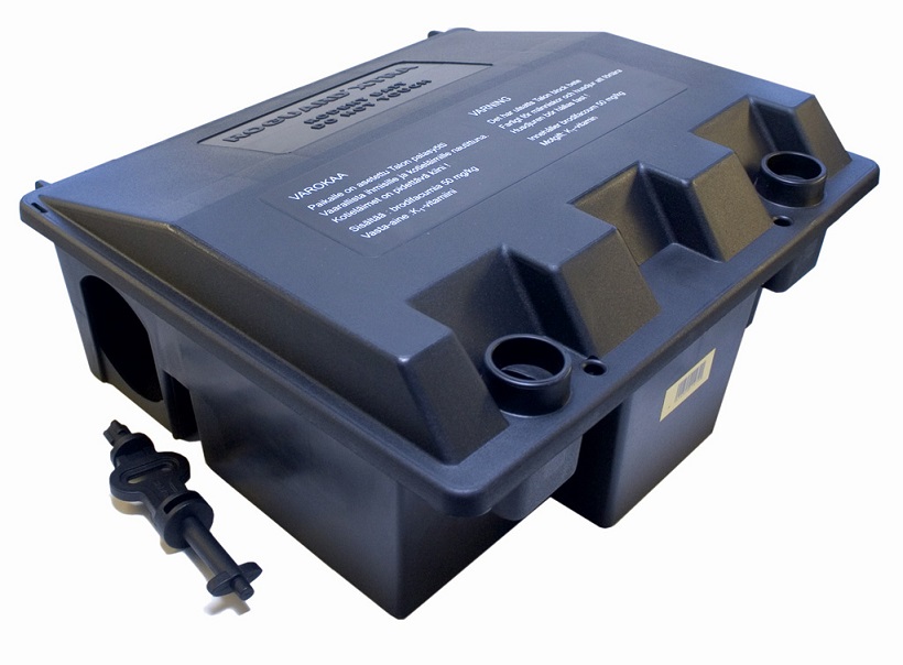 Vahvasta muovista valmistettu syöttilaatikko sekä sisä- että ulkokäyttöön. Laatikossa on kaksi kulkuaukkoa, jotta varovainenkin rotta uskaltaa mennä