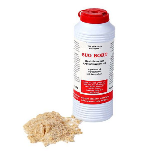 Desinfioiva imeytysjauhe. Imee nesteen nopeasti ja kiinteyttää sen hyytelömäiseksi, hajuttomaksi massaksi joka on helppo koota pois.
